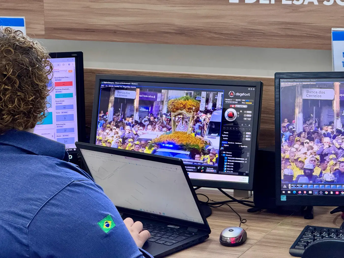CICC e monitoramento – Do Centro Integrado de Comando e Controle é possível acompanhar todas as 49 homenagens previstas ao longo do percurso. Através do mosaico de câmeras do videomonitoramento do Centro Integrado de Operações, o Ciop, os agentes acompanham o desenvolvimento da romaria até a chegada, na Igreja Matriz de Ananindeua.