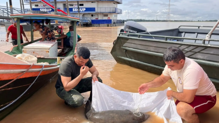 ... 300 quilos de pescado da espécie pirarucu, durante fiscalização fluvial no município de Óbidos, no oeste do Pará...